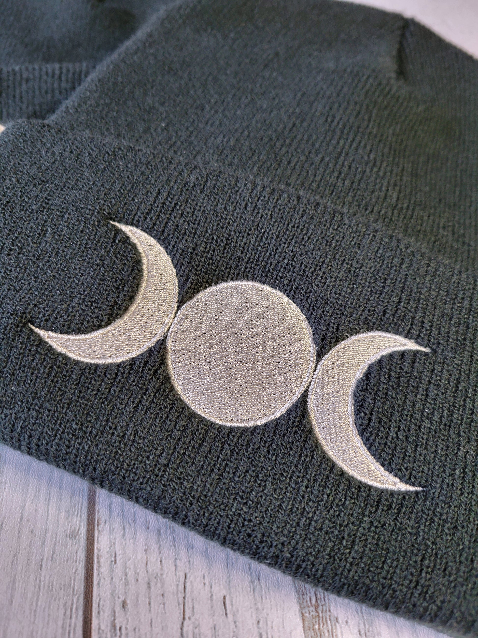 Rock your witchy aesthetic with this Triple Moon Black Beanie. Adorned with an embroidered silver triple moon design, it's the perfect cozy companion for anyone who vibes with lunar magic and pagan culture. Mystical, warm, and undeniably cool.